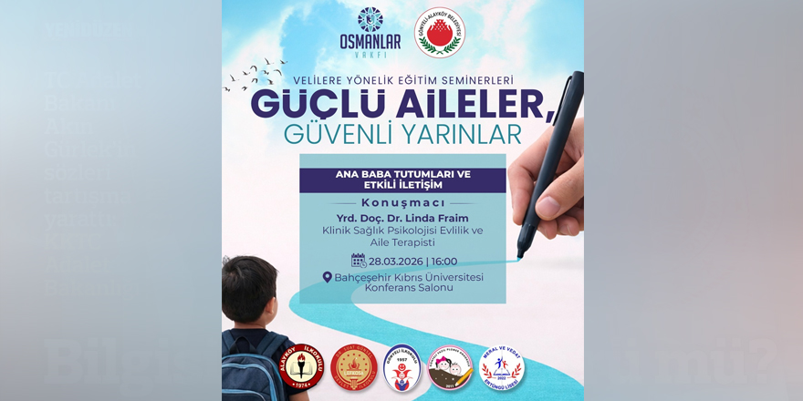 Belediyeden verilen bilgiye göre, Yrd. Doç. Dr. Linda Fraim'in “Ana Baba Tutumları ve Etkili İletişim”i anlatacağı velilere yönelik bu son seminer yarın saat 16.00’da Bahçeşehir Kıbrıs Üniversitesi Konferans Salonu’nda olacak.