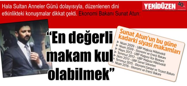 Ekonomi Bakanı Sunat Atun, yaşam içerisinde herkesin birçok görevi olduğunu söyleyerek “Kimimiz öğretmen, kimimiz memuruz. Kimimiz yönetici, kimimiz de hükümette görevliyiz. Bazen kendimizi bu görevlere çok kaptırır, dünyaya neden geldiğimizi unuturuz. Ben geçen bu sürede anladım ki, dünyanın en değerli makamı kul olabilmekte” dedi.