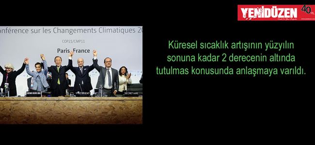 Fransa'nın başkenti Paris'te yaklaşık 200'e yakın ülkenin katılımıyla iki haftadır devam eden iklim konferansında, küresel sıcaklık artışının yüzyılın sonuna kadar 2 derecenin altında tutulmasını konusunda anlaşmaya varıldı.