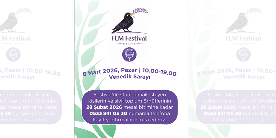 Program detaylarının önümüzdeki günlerde açıklanacağı etkinlikte stant açmak, etkinlik sergilemek, toplumla buluşmak ve mesaj iletmek isteyen kadınlar ile sivil toplum örgütlerinin, en geç 28 Şubat Cumartesi gününe kadar 0533 8410530 numaralı telefondan CTP Kadın Örgütü Mağusa İlçesi’ne ön kayıt yaptırması gerekiyor.