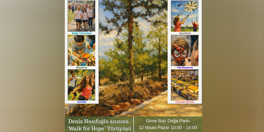 Merhum Deniz Nasıfoğlu anısına gerçekleştirilecek olan ‘Walk for Hope’ yürüyüşü, 12 Nisan Pazar günü Girne Batı Doğa Parkı’nda saat 10.00-14.00 saatleri arasında yapılacak.