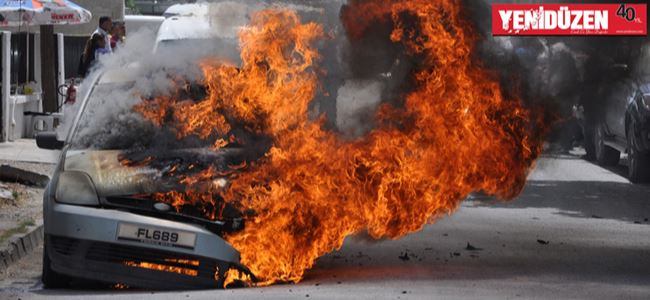 Lefkoşa’da, Telekomünikasyon Dairesi’nin önünde park halinde olan araç alev alarak yandı.