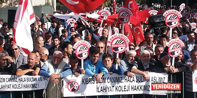 Hala Sultan İlahiyat Koleji Okul Aile Birliği ile Okuluma Dokunma Platformu tarafından düzenlenen mitingde kuran okundu, tekbir sesleri yükseldi. Mitingde, Kıbrıs Türk Orta Eğitim Öğretmenler Sendikası’na yönelik “Sendika Şaşırma Sabrımızı Taşırma”, “Vur Vur İnlesin Sendika Dinlesin” sloganları atıldı.